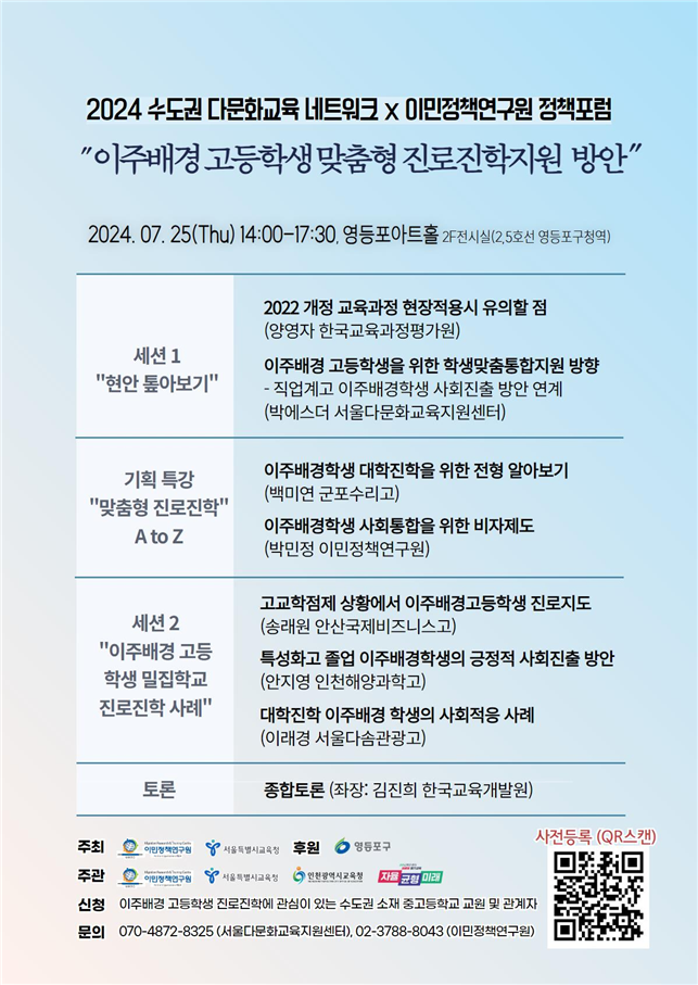 이번 교육정책포럼은 이주배경 고등학생이 밀집된 학교의 고충을 파악하고, 2022 개정 교육과정 적용 시 이주배경 학생들을 위해 고려할 사항을 공유하는 자리로, 이를 통해 급변하는 사회에서 맞춤형 진로지원을 위한 구체적 방안을 모색했다.