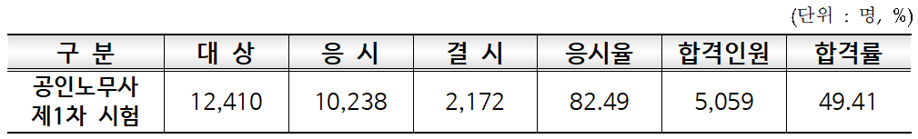이번 시험은 지난 5월 24일(토) 서울, 부산, 대구, 인천, 광주, 대전 등 6개 지역본부에서 동시에 진행됐다. 당초 1차 시험에 접수한 인원은 총 12,410명이었고, 이 가운데 2,172명이 시험을 치르지 않아 실제 응시자는 10,238명이었다. 한국산업인력공단은 오늘(25일) 큐넷 공인노무사 홈페이지를 통해 합격자 명단과 개인별 성적을 공개했다.