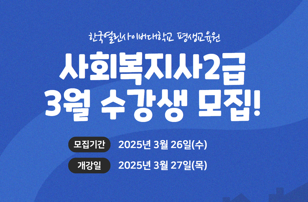 본 과정은 사회복지 이론과 실무를 효과적으로 익힐 수 있도록 구성되어 있으며, 자격증 취득 후 다양한 복지 기관에서 활동할 수 있는 기회를 제공한다. 모집 기간은 2025년 3월 26일까지이며, 개강일은 2025년 3월 27일이다.