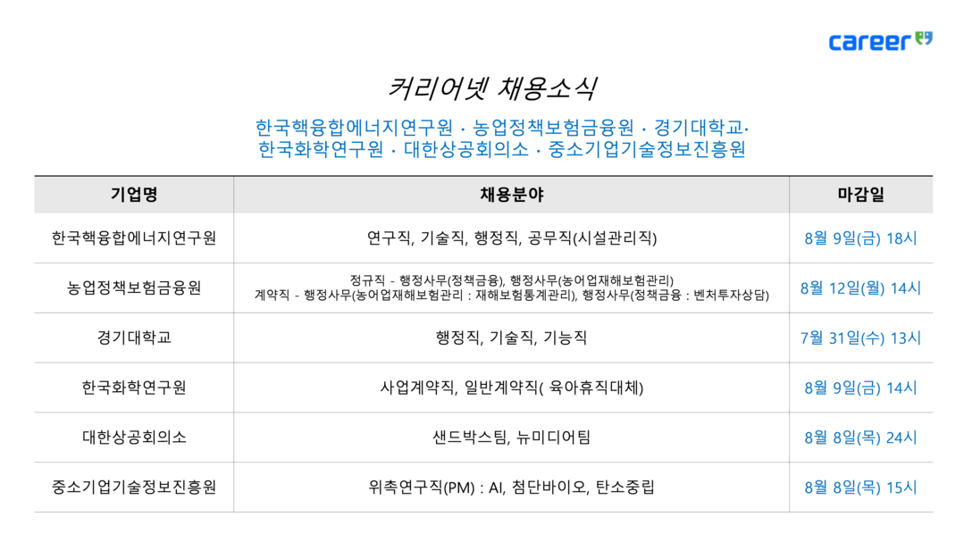 [피앤피뉴스=마성배 기자] 커리어넷이 한국핵융합에너지연구원, 농업정책보험금융원, 경기대학교, 한국화학연구원, 대한상공회의소, 중소기업기술정보진흥원의 신규 직원 채용 소식을 30일 발표했다.