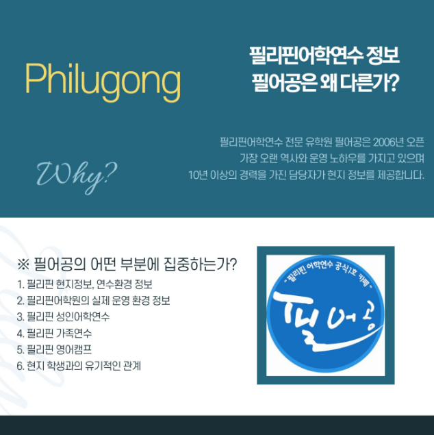 필어공은 필리핀 전문유학원으로 2006년부터 지금까지 수 많은 학생들에게 다양한 정보를 제공하고 있다. 성인어학연수 뿐만 아니라 주니어어학연수와 보호자가 함께 하는 필리핀가족연수 필리핀가족캠프 및 필리핀한달살기 정보, 보호자 없이 진행하는 필리핀영어캠프에 대한 방대한 자료를 매일 실시간으로 제공하고 있다.