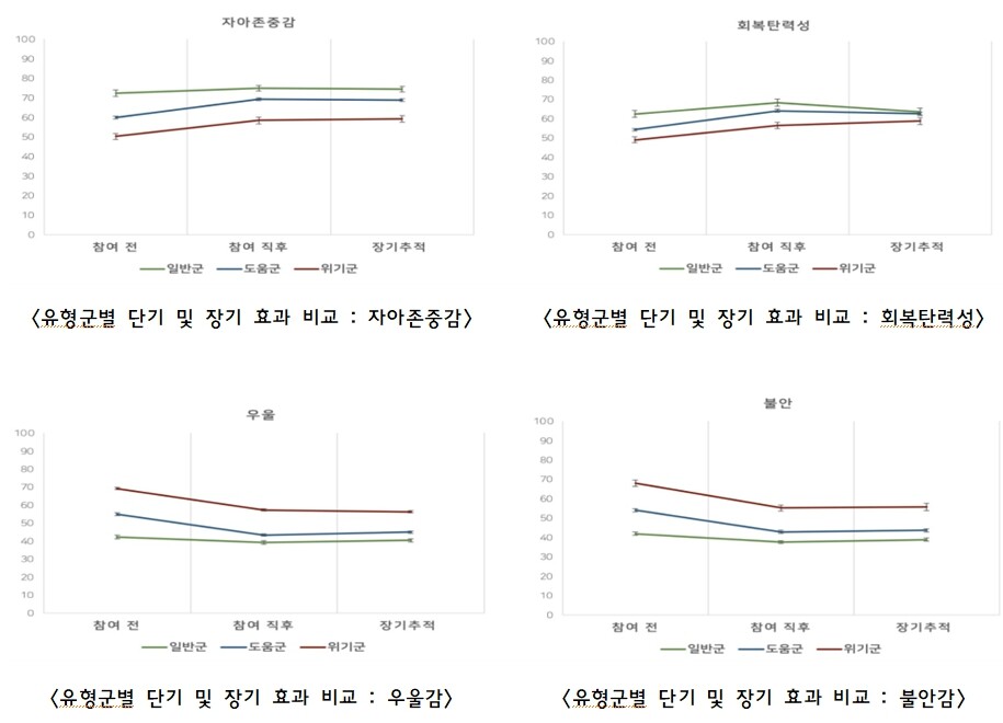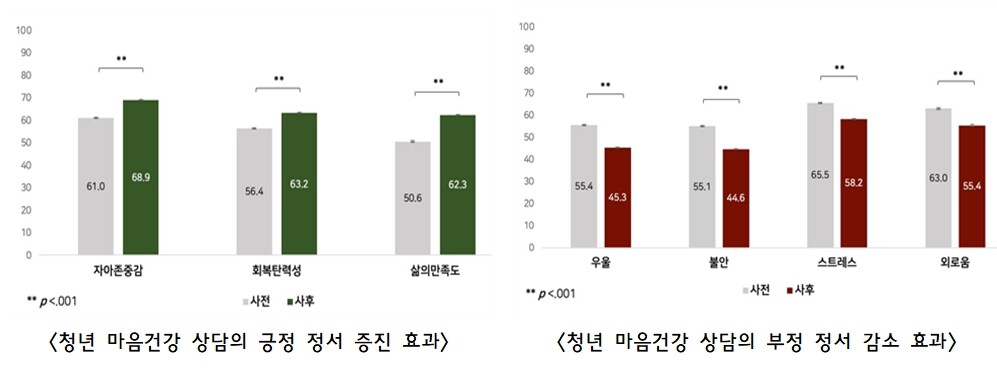 엄소용 연세대학교 의과대학 박사는 “자아존중감 61.0→68.9점, 회복탄력성 56.4→63.2점, 삶의 만족도 50.6→62.3점으로 증가하는 등 공공 정신건강 서비스분야에서 좀처럼 보기 힘든 드라마틱하고 유의미한 수치 변화로 볼 수 있다”면서, “특히, 긍정 정서 증진 효과는 일반군에 비해 도움군, 임상군 청년들에게서 더욱 두드러졌다”고 평가했다.