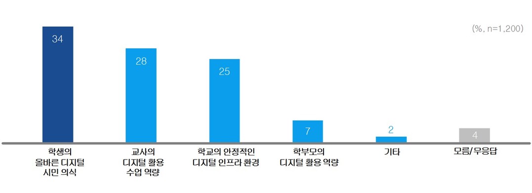 한편, 인공지능 기반 학생 맞춤형 교육 활성화를 위해 가장 중요한 요소로는 도민의 34%가 학생의 올바른 디지털 시민 의식을 꼽았고, 교사의 디지털 활용 수업 역량(28%)과 학교의 안정적인 디지털 인프라 환경(25%)도 중요하다는 응답이 이어졌다.