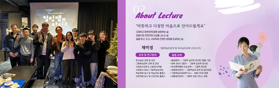 힐링캡프를 기획 및 진행하고 있는 그림책심리치료사 채미정(앤안나)는 “사람의 마음을 들여다 보는 좋은 방법은 바로 책”이라고 말한다. 그래서 그림책으로 심리적 접근을 모색하는 그림책 심리 지도사 자격과정을 많은 사람들이 관심 갖기를 바라고 있다.