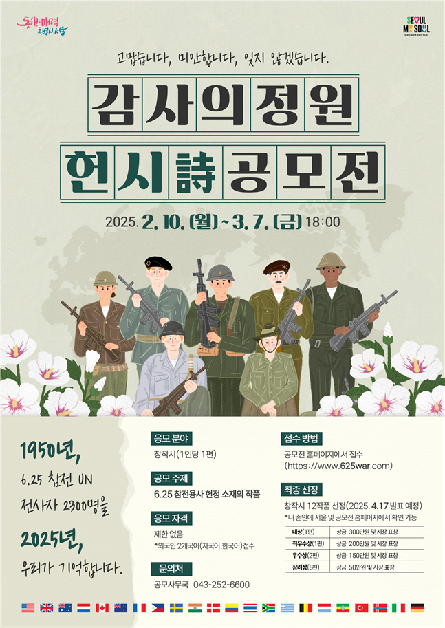 [피앤피뉴스=마성배 기자] 서울시가 6.25전쟁 75주년을 맞아 광화문광장에 조성하는 ‘감사의 정원’에 전시될 창작시를 모집한다. 공모 접수는 2월 10일부터 3월 7일까지이며, 참전국의 희생을 기리는 작품이 최종 선정될 예정이다.