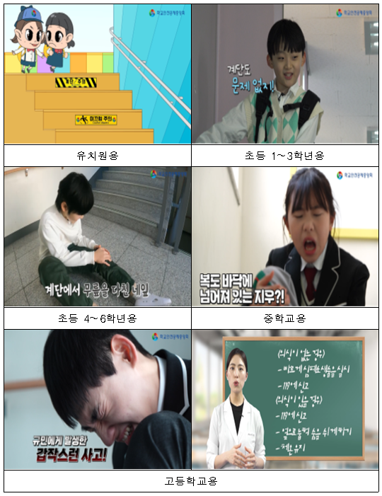 교육부는 지난 5년간의 학교안전사고 통계와 사례를 분석한 결과, 학교 안전사고의 대부분이 교육활동 중에 발생한다는 점에 착안해 체육활동, 현장 체험학습, 실험·실습 등 교육활동을 주제로 유치원부터 초등학교, 중학교, 고등학교에 이르기까지 80편씩 총 400종의 맞춤형 안전교육 콘텐츠를 개발했다.