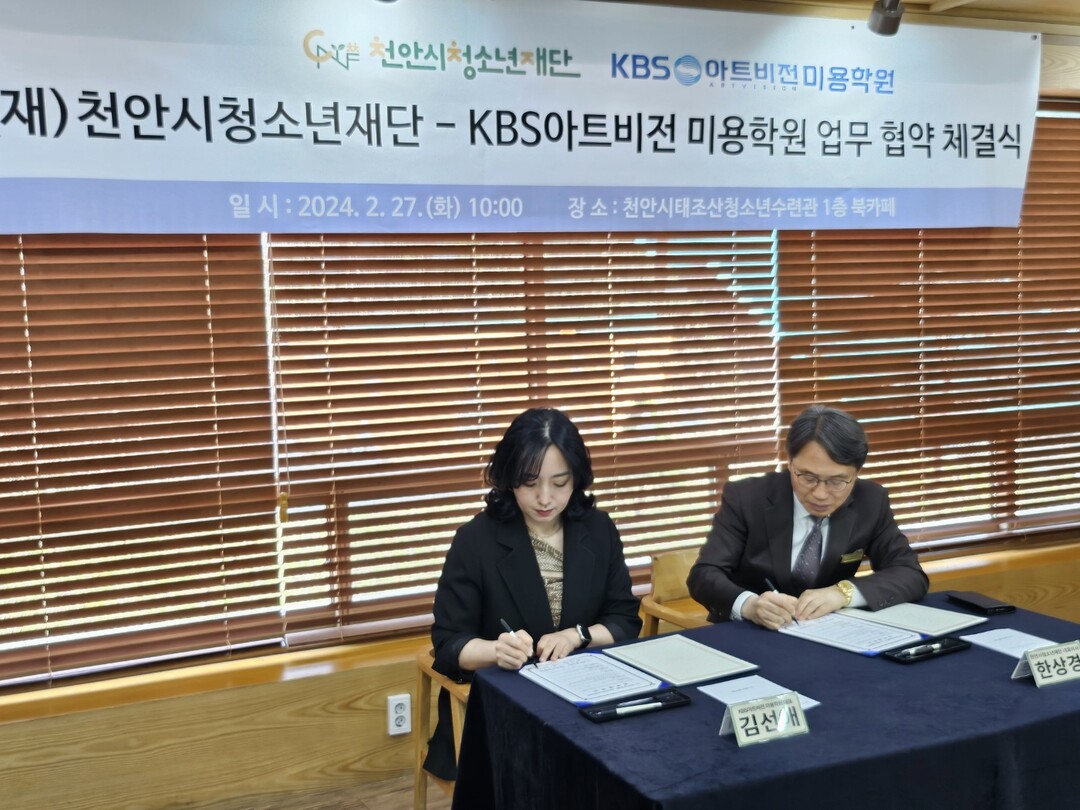 KBS아트비전미용학원천안점은 지역내 청소년들의 뷰티분야 진로활동 및 청소년들의 직업탐색 상호협력을 위해 (재)천안시청소년재단(대표이사 한상경)과 업무협약을 체결했다고 밝혔다. 이번협약은 태조산 청소년수련관에서 양측의 관련 담당자들이 참석한 가운데 진행되었다.