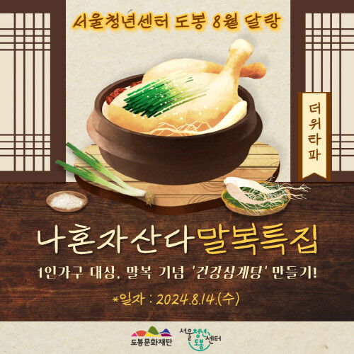 참가자들은 삼계탕을 직접 만들어보며 여름철 건강을 챙기는 법을 배우는 동시에 1인가구를 위한 정책이나 유용한 정보들을 조별로 나누는 시간을 갖게 된다. 이 행사는 서울청년센터 도봉 1층 소셜라운지에서 진행될 예정이다.