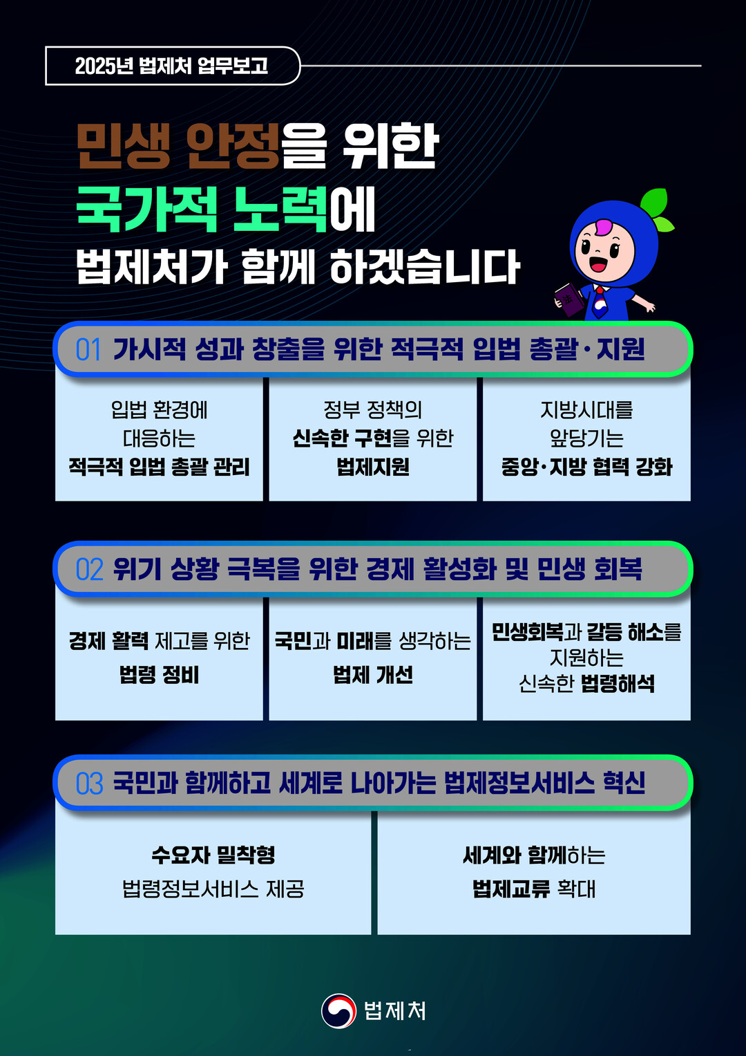 [피앤피뉴스=마성배 기자] 법제처(처장 이완규)는 22일 ‘2025년 주요 업무 추진 계획’을 공개하며, 민생 안정, 법제 혁신, 디지털 전환, 글로벌 협력을 중심으로 한 법제 혁신 방안을 발표했다. 이번 계획은 국민의 삶의 질을 높이고 법제처의 국제적 위상을 강화하기 위한 구체적인 비전과 실행 전략을 담고 있다.