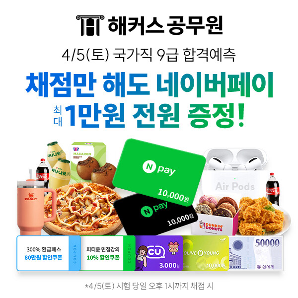4월 5일(토) 국가직 9급 시험일 당일에는 채점 이벤트를 진행해, 시험 당일 오후 1시까지 채점한 전원에게는 네이버페이 1만 원을 제공하며, 오후 2시까지 채점 시 네이버페이 9천 원, 오후 3시까지 채점 시 네이버페이 5천 원을 전원에게 제공한다. 시험 당일 채점한 인원 중 추첨을 통해 네이버페이 1만 원도 제공할 예정이다. (*1,000명)