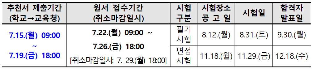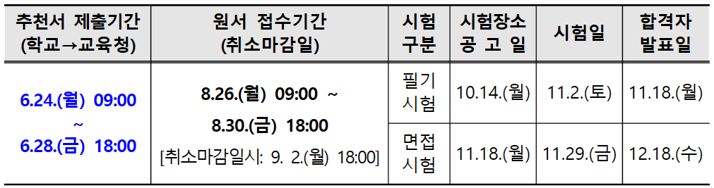 응시원서는 7월 22일부터 26일까지 접수하고, 7월 15일부터 19일까지 학교장 추천을 받아야만 응시원서 접수가 가능하다. 필기시험은 8월 31일 실시되며 면접시험을 11월 29일 치른 후 12월 18일 최종합격자를 발표한다. 최종합격자는 2025년 상반기(예정) 중 6개월간 수습기간 이후 평가 및 임용심사 등을 거쳐 9급 교육행정직 공무원으로 임용될 예정이다.