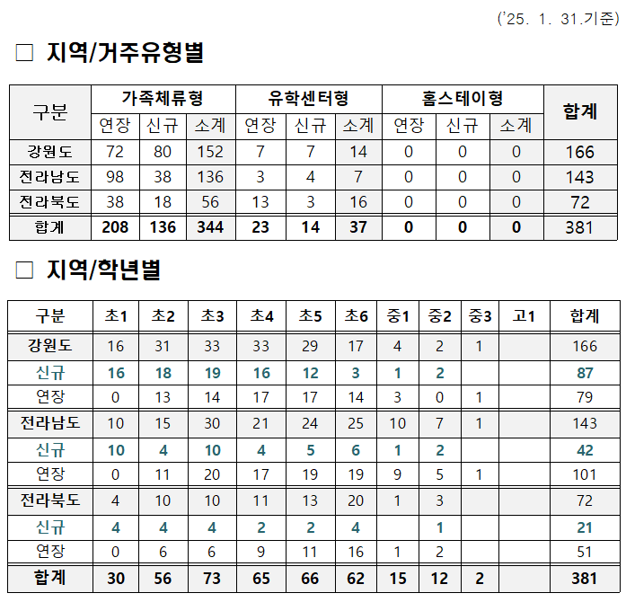 지역별 참여 현황을 살펴보면, 강원도 166명(신규 87명, 연장 79명), 전남 143명(신규 42명, 연장 101명), 전북 72명(신규 21명, 연장 51명)으로, 강원 지역이 신규 신청자가 가장 많고, 전남 지역은 연장 신청자가 가장 많았다.