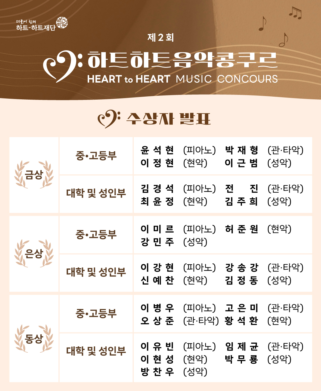 금상 수상자들이 겨루게 될 결선은 오는 4월 17일(수) 하트-하트재단 리사이틀홀에서 진행된다. 결선 경연을 통해 대상 수상자 1명을 최종 선발할 예정이며 대상 수상자와 부문별 금, 은, 동 수상자들에게는 상장과 총 3천만 원의 상금을 수여할 예정이다.