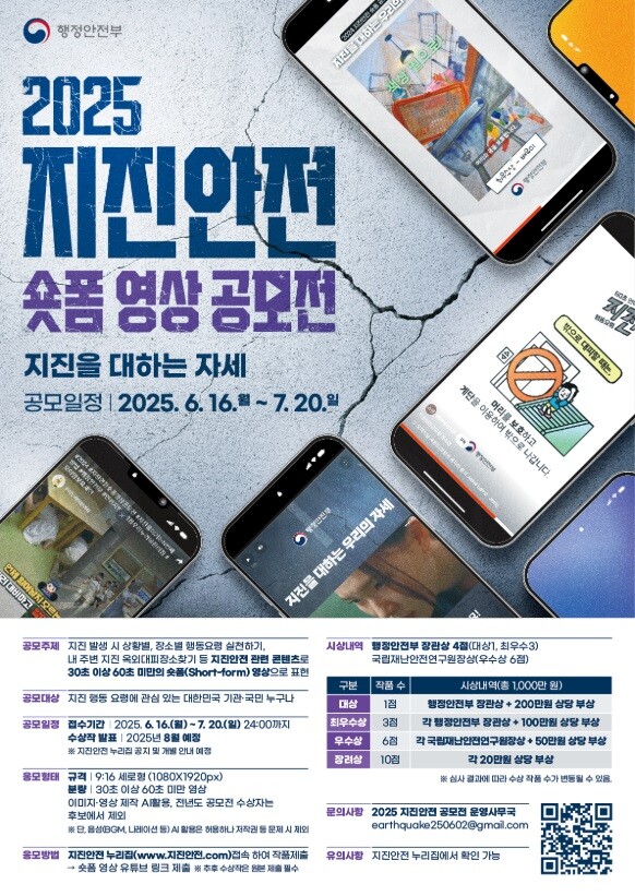 행정안전부는 오는 6월 16일(일)부터 7월 20일(토)까지 약 한 달간 ‘2025 지진안전 숏폼 영상 공모전’을 개최한다고 밝혔다.