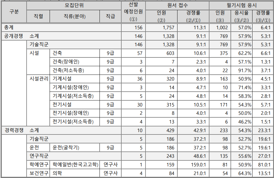 모집 분야별 필기시험 경쟁률은 ▲건축(일반) 9급 6.6대 1 ▲건축(장애인) 9급 1.3대 1 ▲건축(저소득층) 9급 3.7대 1 ▲기계시설(일반) 9급 4.5대 1 ▲기계시설(장애인) 9급 3.3대 1 ▲기계시설(저소득층) 9급 2.8대 1 ▲전기시설(일반) 9급 5.7대 1 ▲전기시설(장애인) 9급 2.0대 1 ▲전기시설(저소득층) 9급 1.5대 1이다.