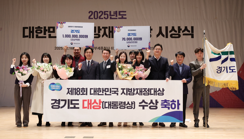 | ▲김민재 행정안전부 차관이 16일 오후 정부세종청사 6동 대강당에서 열린 ‘2025 대한민국 지방재정대상 시상식’에서 무기명정기예금 등 은닉성 채권 추적조사를 통해 조세정의 실현에 기여한 공로로 대통령상을 수상한 경기도 본청 관계자들과 기념촬영을 하고 있다. |