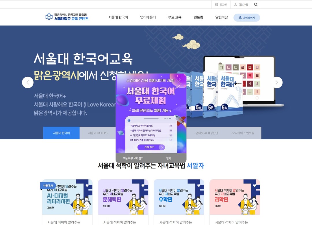 체험에 포함되는 대표 내용은 서울대학교 출판문화원의 ‘한국어 플러스’ 교재를 기반으로 맑은소프트가 구축한 한국어 강의다. 아울러 ‘서울대 석학이 알려주는 자녀교육법’, 서울대학교기술지주 자회사 앱티마이저의 ‘AI적성진로 학부모 교육과정’, 서울대 IM-TEPS 기출 동영상 강좌 등도 순차 제공한다는 계획이다. 신청은 11월 1일부터 가능하며, 체험 기간은 금년 말까지다.