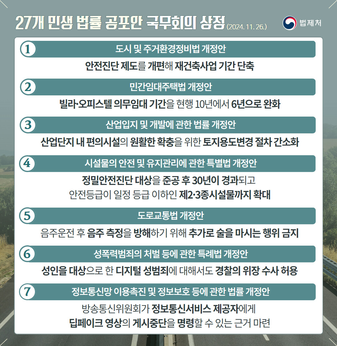 [피앤피뉴스=마성배 기자] 법제처(처장 이완규)는 지난 14일 국회를 통과한 27개의 법률공포안이 11월 26일 국무회의에 상정됐다고 밝혔다. 이번 법안들은 내년 중순부터 시행되며, 주거안정, 교통안전, 디지털 성범죄 예방, 산업 활성화 등 국민 생활과 직결된 다양한 영역에서의 변화가 예상된다.