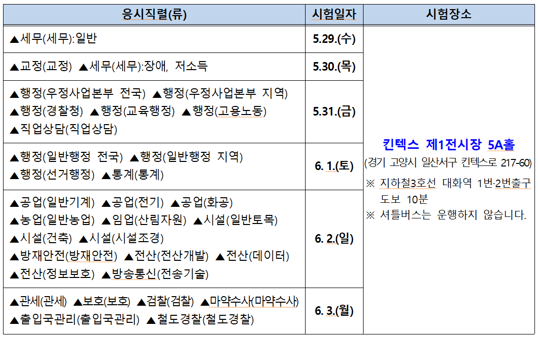 인사혁신처는 면접시험과 관련해 “모든 응시자는 지정된 시험일시·시험장에서만 면접시험에 응시할 수 있으므로 본인 응시일정(시험일, 오전·오후)을 반드시 확인하기 바란다”며 “응시자는 시험당일 응시표와 신분증, 필기구를 지참해 응시자 대기장(KINTEX 제1전시장 5A홀)으로 입장해서 본인 자리에 비치된 명찰을 가슴에 패용하고 해당 좌석에 착석하면 된다”고 덧붙였다.