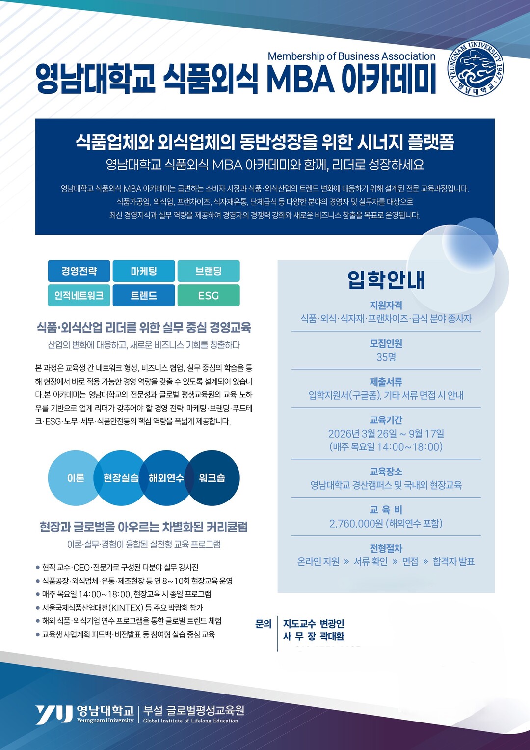 영남대학교 부설 글로벌평생교육원은 오는 3월 26일 개강하는 ‘식품외식 MBA 아카데미’의 신입생을 모집한다고 밝혔다. 이번 과정은 단순한 지식 전달을 넘어, 식품업체와 외식업체의 동반 성장을 위한 ‘시너지 플랫폼’ 구축을 목표로 한다.