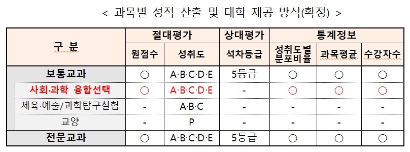 고등학교 융합 선택과목 중 사회·과학 교과(9개 과목)는 상대평가 석차등급을 기재하지 않는다. 이는 대입 안정성을 확보하면서도 고교학점제에서의 학생 선택권을 확대하고, 융합학습의 대표교과인 사회·과학 융합선택 활성화를 통해 교과 융합 및 실생활과 연계한 탐구‧문제해결 중심으로 수업을 내실화할 수 있으며, 사회·과학 융합선택 중심으로만 이수하지 않도록 장학 지도 실시, 교육과정 개정 시 보완방안을 강구할 계획이다.