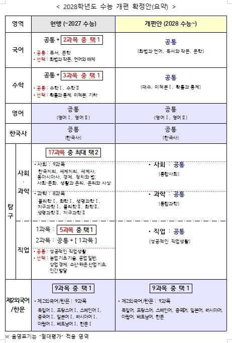 확정된 2028학년도 대학입시제도 개편 확정안의 내용은 통합형 과목체계 도입은 개편 시안대로 국어, 수학, 사회·과학탐구, 직업탐구 영역은 선택과목제 폐지하고 사회·과학탐구 영역은 2022년 개정 교육과정 교과목인 ‘통합사회’와 ‘통합과학’을 출제하며, 모든 응시자가 선택 없이 동일하게 응시한다. 사회, 과학 2개 모두 응시 가능하고, 다만 대입전형 활용 등을 고려해 시험시간과 점수는 분리한다.