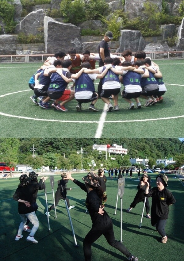 <한 기업체 신입사원들이 연수에 참가해 조직활성화 팀빌딩 훈련을 하고 있다.>