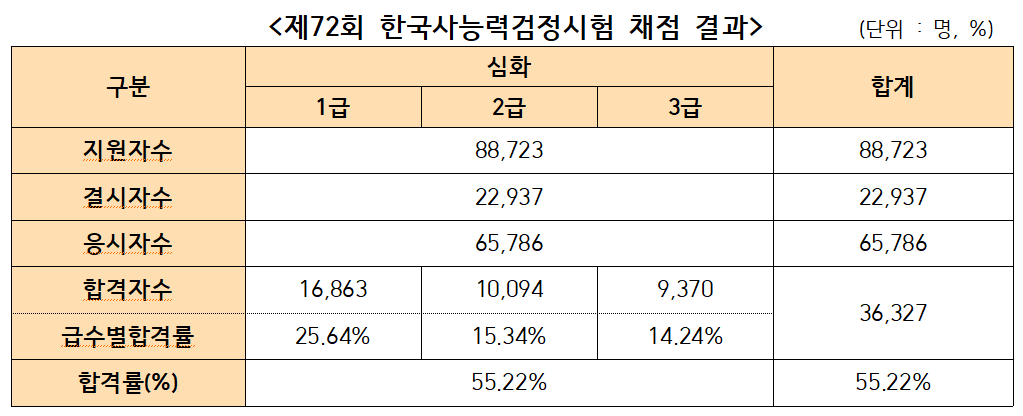 이번 제72회 시험에는 총 88,723명이 지원했으며, 이 중 65,786명이 실제로 시험에 응시해 응시율 74%를 기록했다. 최종 합격자는 36,327명으로, 평균 합격률은 55.22%로 나타났다.