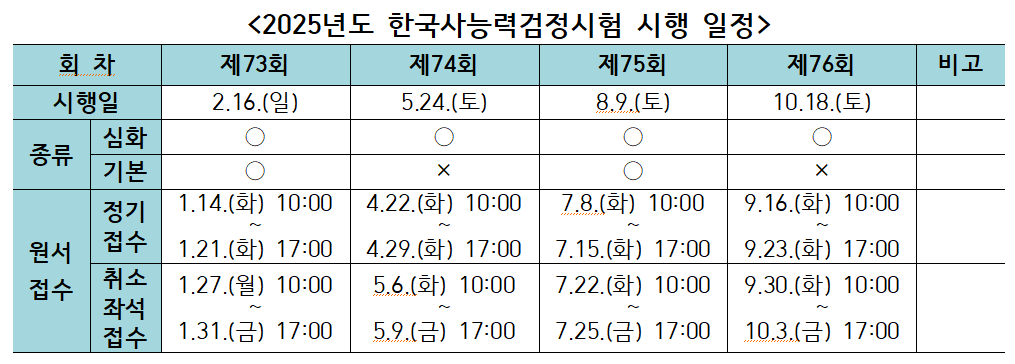 2025년도 한국사능력검정시험 일정도 함께 공개됐다. 내년에는 심화 과정 4회, 기본 과정 2회가 예정되어 있으며, 제73회 시험은 주말인 2월 16일(일)에 시행될 예정이다.