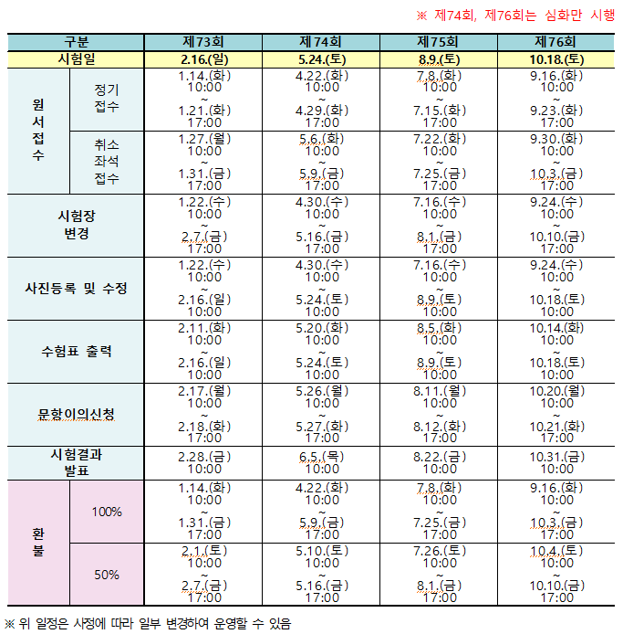 73회 2월 16일(일), 74회 5월 24일, 75회 8월 9일, 76회 10월 18일에 시행