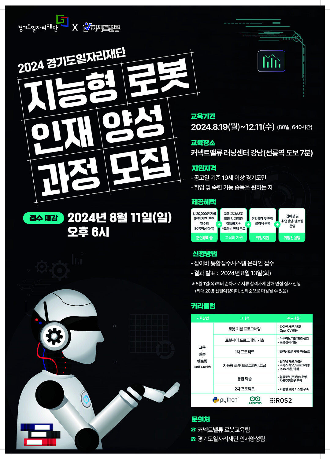 지능형 로봇 분야에 관심이 있는 19세 이상 경기도민은 누구나 경기도일자리재단에서 운영하는 '잡아바 어플라이'를 통해 오는 8월 11일 오후 6시까지 온라인으로 접수할 수 있다. 신청자 가운데 적격 심사를 거쳐 8월 13일 최종 교육생이 선정되며, 교육은 8월 19일부터 12월 11일까지 진행된다. 자세한 내용은 경기도일자리재단 인재양성팀 혹은 커넥트밸류 로봇교육팀에 문의해 확인 가능하다.