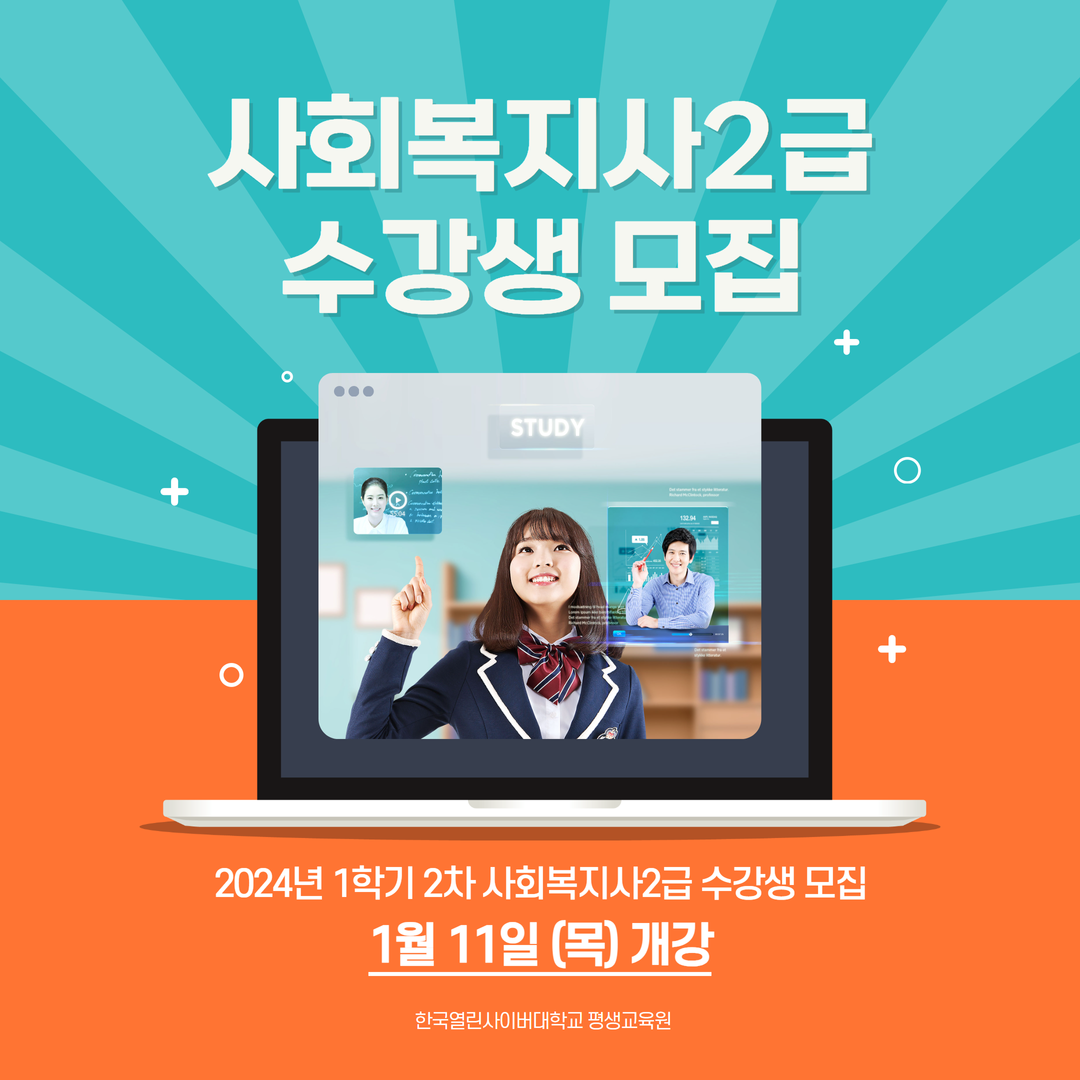 [피앤피뉴스=마성배 기자] 한국열린사이버대학교 평생교육원에서 2024년 새해를 맞이하며 다양한 혜택을 담아 사회복지사 2급 1학기 2차 수강생을 모집한다고 밝혔다. 모집 마감일은 1월 10일이며 개강 일은 다음날인 1월 11일 목요일이다.