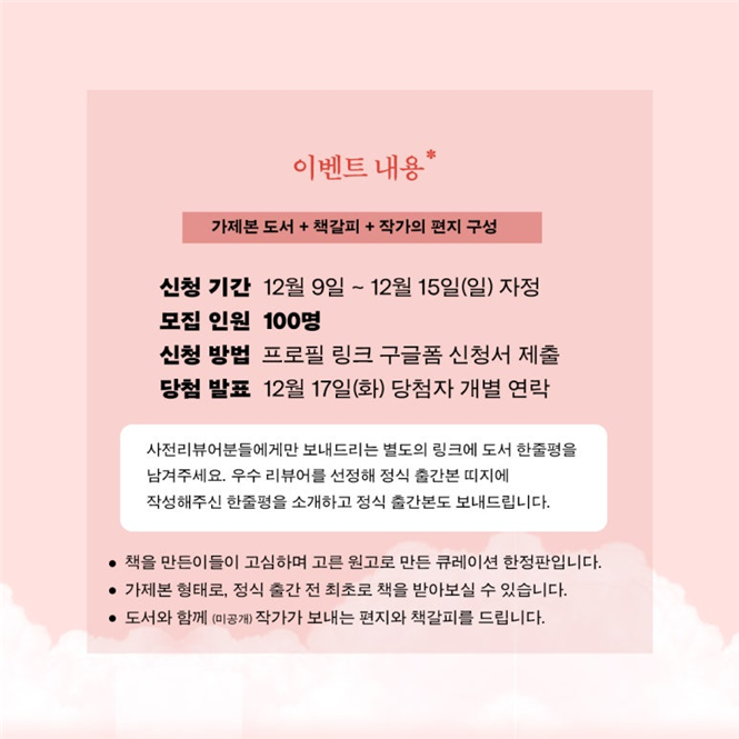 선발된 서평단은 ‘사랑없이 우리가 법을 말할 수 있을까’ 큐레이션 한정판 도서와 일러스트 책갈피, 천수이 작가가 쓴 편지를 받아볼 수 있으며 도서 수령일로부터 10일 이내에 개인 SNS와 온라인 서점 1곳에 서평을 업로드하면 된다. 우수 리뷰어의 한줄평은 정식 출간본 띠지에 기재된다.