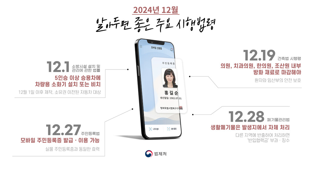 [피앤피뉴스=마성배 기자] 디지털 전환과 안전 강화를 목표로 하는 새로운 법령들이 12월부터 시행된다. 법제처는 12월 중 시행되는 법령 33건을 공개하며, 모바일 주민등록증 도입과 차량 소화기 설치 의무화 등 국민 일상에 변화를 가져올 주요 사항들을 발표했다.