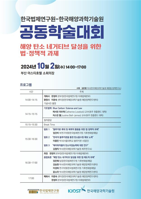 [피앤피뉴스=마성배 기자] 한국법제연구원과 한국해양과학기술원이 2일 부산 아스티호텔에서 ‘해양 탄소 네거티브 달성을 위한 법정책적 과제’를 주제로 공동학술대회를 연다.