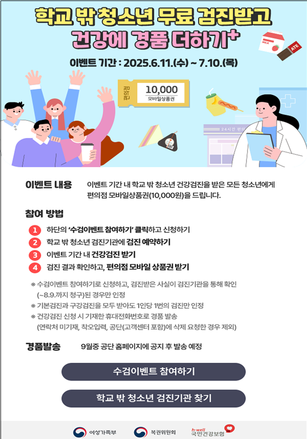 또한, 행사 기간 동안 검진을 완료한 청소년에게는 1만 원 상당의 편의점 모바일 상품권이 제공되며, 해당 상품권은 9월 중 국민건강보험공단 누리집 공지를 통해 일괄 발송될 예정이다.