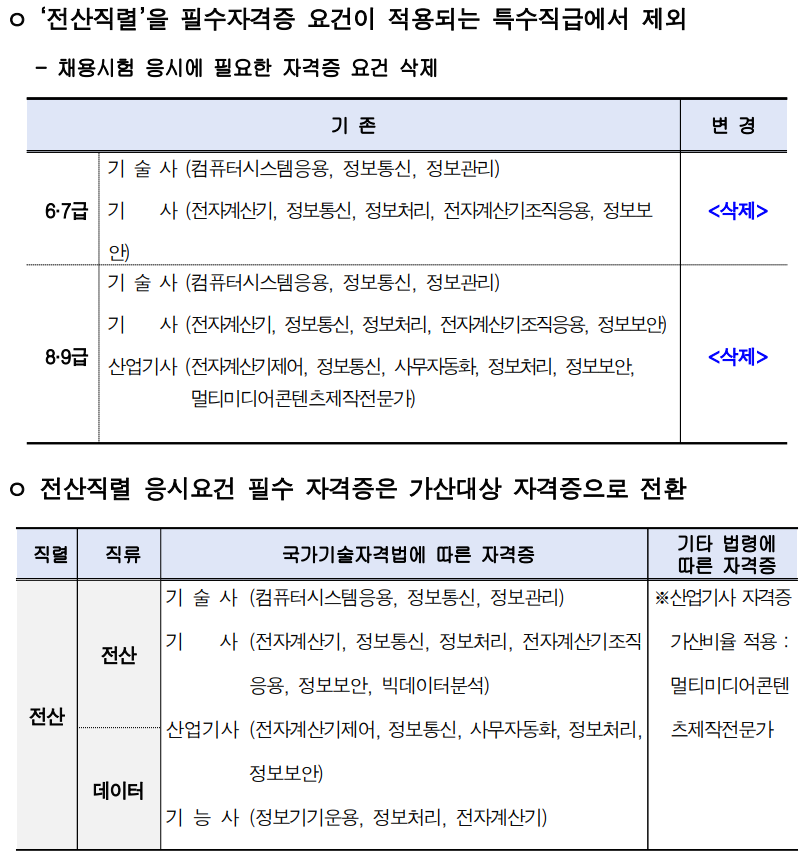전산직렬은 응시요건 필수 자격증에서 가산 대상 자격증으로 전환된다.