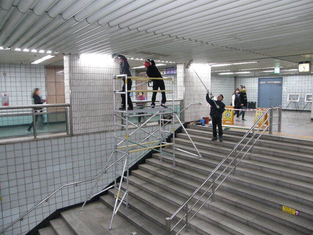 ▲지하철 역사 내 계단 상부에서 작업자들이 타워형 안전작업대를 활용해 천장 보수 작업을 진행하고 있다. 고소 작업 시 추락 사고를 예방하기 위해 안전난간이 설치된 작업대를 사용한 모습으로, 소규모 건설·유지보수 현장에서 안전시설의 중요성을 보여준다.