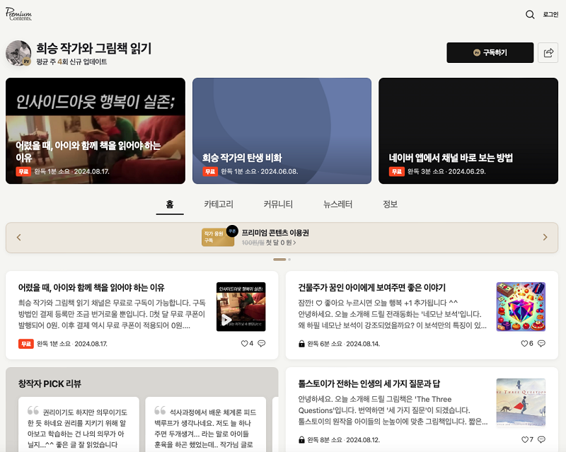 [피앤피뉴스=마성배 기자] 네이버 유료 콘텐츠 구독 플랫폼 ‘프리미엄 콘텐츠’에서 아이들을 위해 무료를 선언한 채널이 있다. 그림책 전문 채널인 ‘희승 작가와 그림책 읽기’ 채널이다. 현재 자녀를 둔 부모들 사이에서 인기를 얻고 있는데, 채널을 운영하는 변희승 아동문학가는 올해 들어 구독자 수가 두 배 이상 증가했다고 밝혔다.