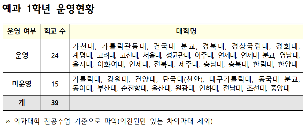 교육부는 올해 신입생인 예과 1학년 수업의 경우(1개 의전원 제외, 39개 대학) 교양수업 비중이 높은 특성 등을 고려해 따로 운영현황을 파악한 결과 총 24개교에서 수업을 운영하고 있는 것으로 확인됐다.