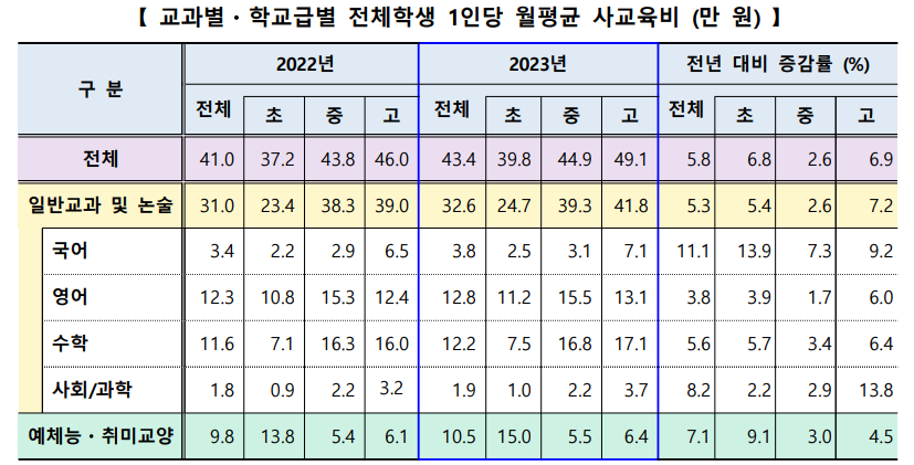 교육부와 통계청은 공동으로 전국 초·중·고 약 3,000여 학교의 74,000명 학생을 대상으로 ‘2023년 초중고 사교육비 조사’를 실시했다고 14일 밝혔다.