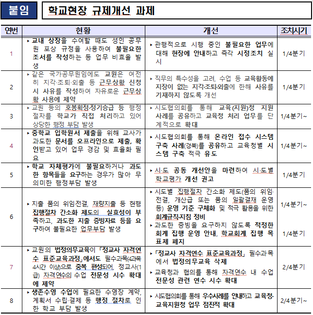 학생에게 교내 상장을 수여하면서 공무원 포상 규정을 적용해 공적조서를 작성하던 관행은 중단하도록 안내한다. 또 1급 정교사 자격연수 과정에서 법정의무교육을 과도하게 편성하던 방식도 개선해, 교원의 전문성 향상에 필요한 과목 비중을 늘린다.