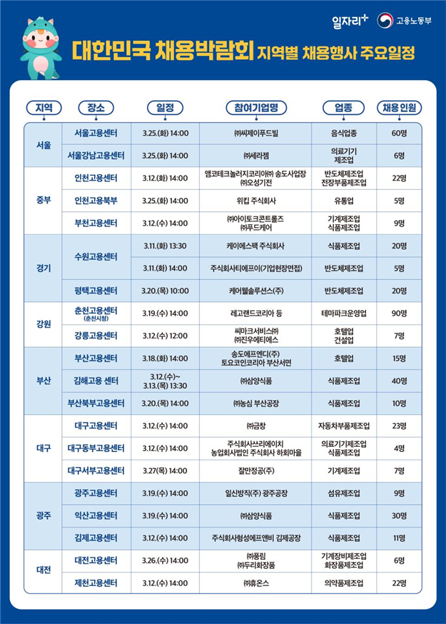 3월 10일부터 공식 누리집(대한민국채용박람회.kr)에서 참여 기업별 채용 정보와 행사장 배치도를 확인할 수 있으며, 전국 고용센터를 중심으로 각 지역별 채용행사도 동시에 진행된다.
