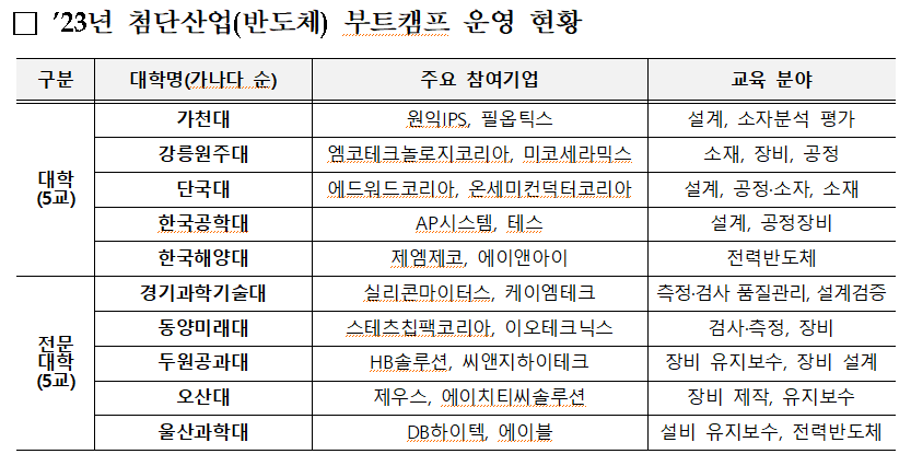 한편, ‘첨단산업 인재양성 부트캠프’는 취업을 희망하는 대학생들을 대상으로 전공과 관계없이 반도체 등 첨단산업 분야 단기 집중교육과정을 제공하는 사업이다. 지난해 10개 대학·전문대학이 161개 기업과 함께 159개 교육과정을 운영해 1,255명의 인재를 양성했다.