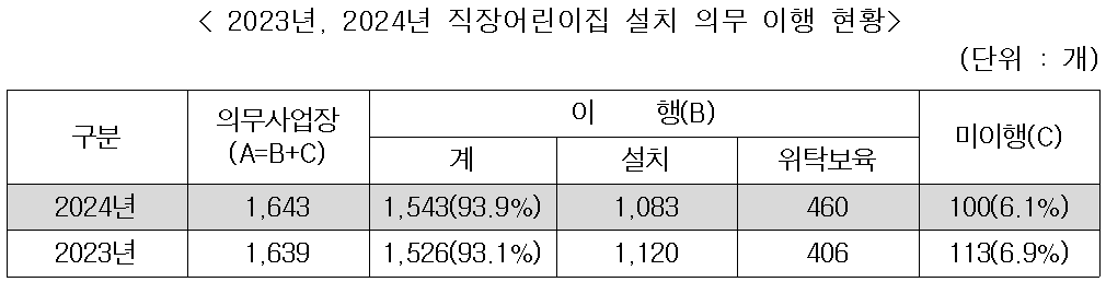 2024년 기준 실태조사 결과에 따르면, 전체 설치 의무 사업장 1,643곳 가운데 1,083곳이 직장어린이집을 직접 설치했고, 460곳은 위탁 보육 형태로 의무를 이행했다. 이를 통해 전체 이행률은 93.9%로, 전년 대비 0.8%p 소폭 상승한 것으로 나타났다.