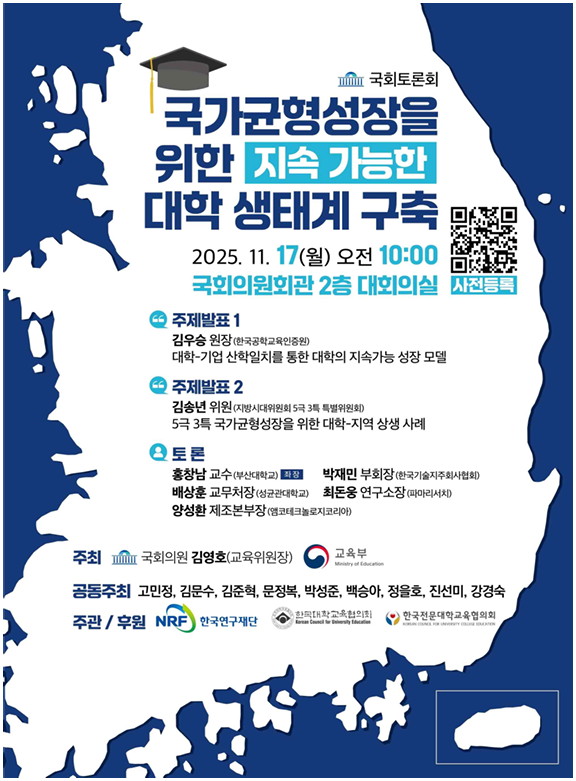 17일 오전 국회의원회관 대회의실에서 열리는 이번 국회 토론회는 김영호 국회 교육위원장이 교육부와 공동 주최하며, 여야 의원 9명이 공동주최에 참여한다. 한국연구재단이 주관하고, 한국대학교육협의회·한국전문대학교육협의회가 후원한다.