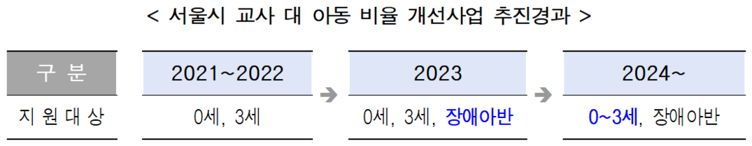 마채숙 서울시 여성가족실장은 “국고 지원이 시작된 0세반 외에도 자체 사업을 통해 1세부터 3세반과 장애아반 지원을 이어갈 계획”이라며 “연령과 유형에 관계없이 안정적인 돌봄 환경이 유지될 수 있도록 지원 범위를 관리하겠다”고 말했다.