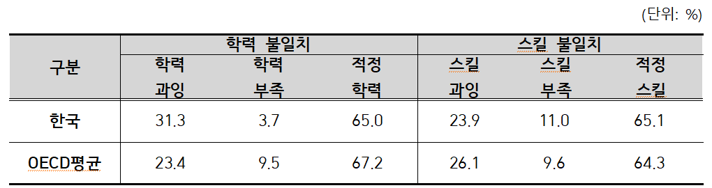 학력불일치 조사에서는 성인의 31.3%가 실제 학력보다 높은 수준의 일자리에 종사하는 ‘학력과잉’ 상태로 확인됐다. 반면, ‘학력부족’은 3.7%에 불과했다. 스킬불일치 조사에서도 23.9%가 업무에 비해 과도한 스킬을 보유한 반면, 11.0%는 업무에 필요한 스킬이 부족하다고 나타났다.
