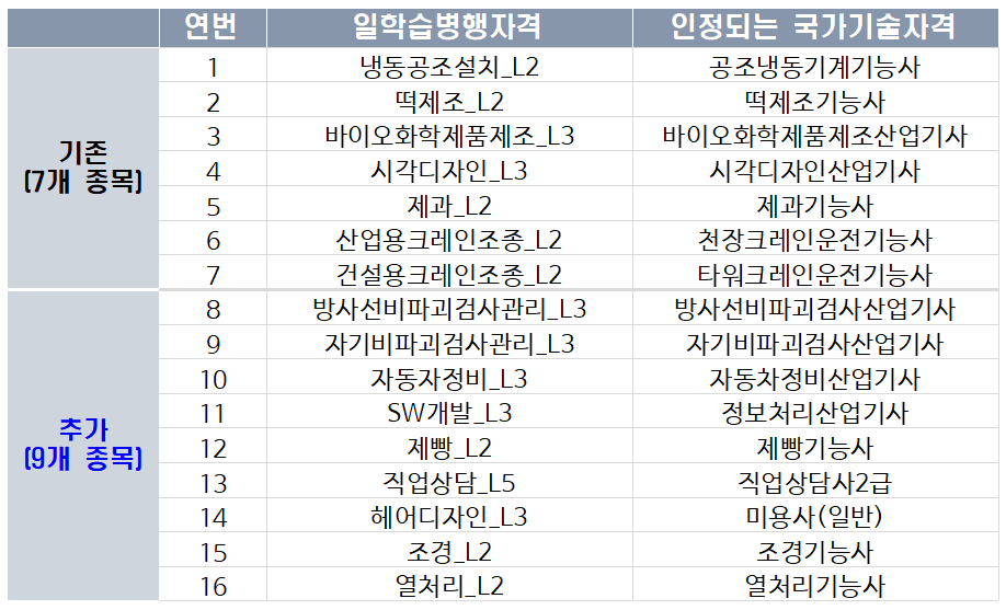 경력 요건 완화와 함께 자격 인정 체계도 손질된다. 일학습병행 과정을 통해 취득한 자격이 국가기술자격으로 인정되는 범위가 기존 7개에서 16개로 확대된다.