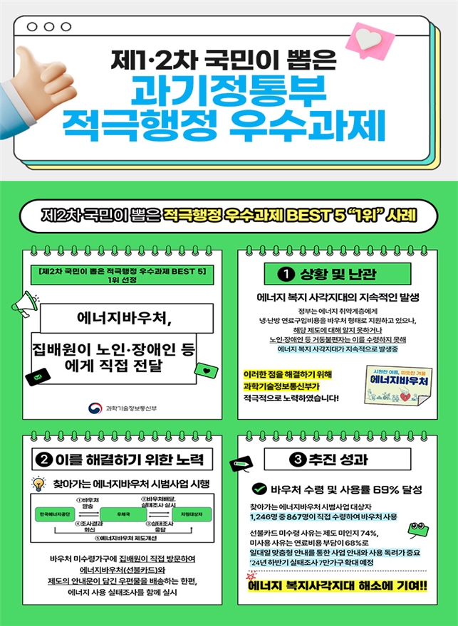 이번 공모에는 총 206건의 과제가 제출됐으며, 과기정통부의 ‘에너지이용권(바우처), 집배원이 어르신·장애인 등에게 직접 전달’ 과제가 국민 9,907명이 참여한 온라인 투표에서 1위를 기록했다.